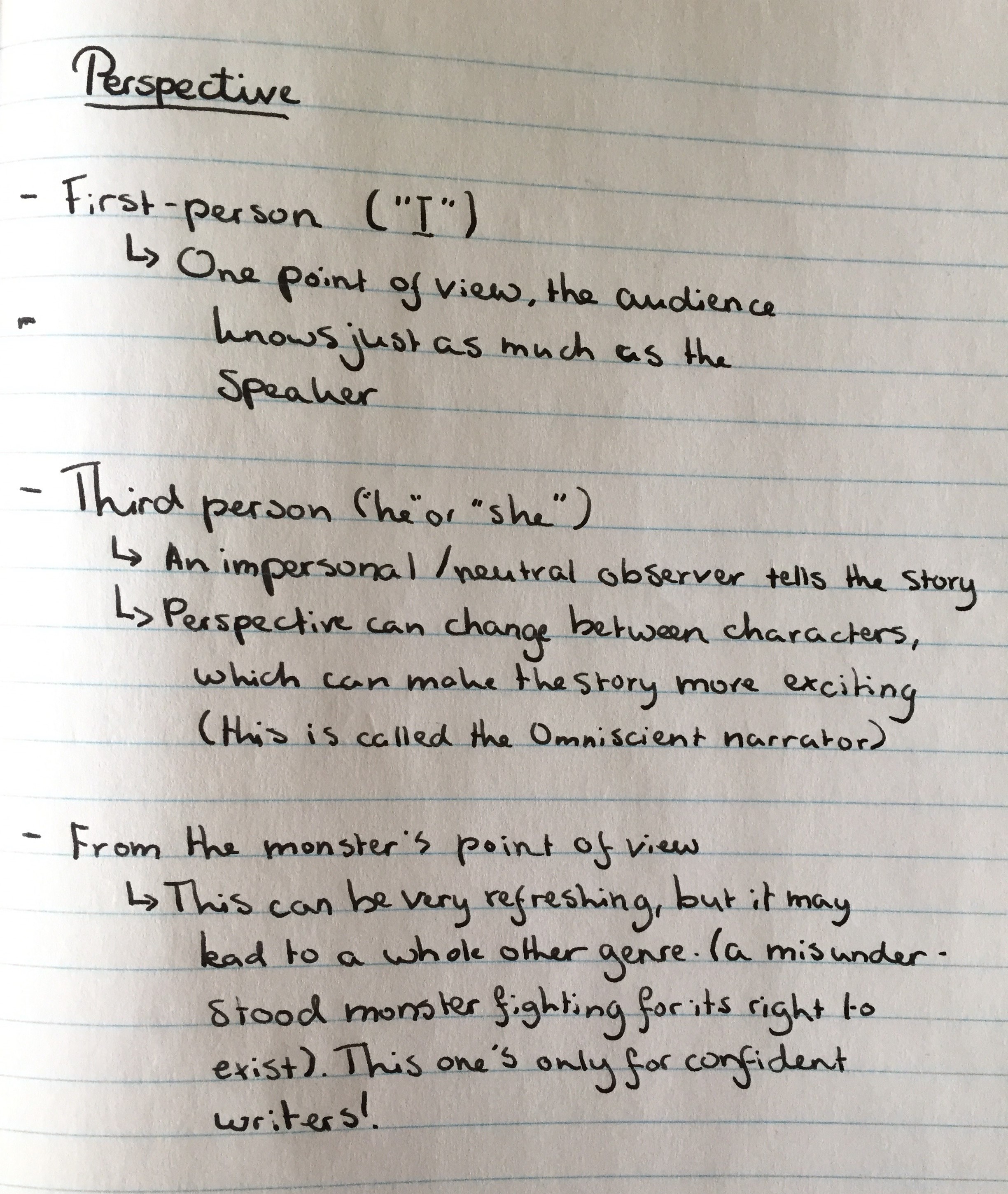 It’s also a good idea to think about what you want to describe when it comes to blood and death (because hey, it’s a horror story, people are supposed to die in them). Do you prefer telling in detail how a body is slowly pulled apart, including sound effects and an in-depth description of tendons snapping, or would you rather leave that to the imagination of the audience? These are things you need to consider while writing, as it influences the kind of horror story you want to tell. One focuses on mystery, while the other’s goal is to show everything with the explicit goal of grossing out your audience.