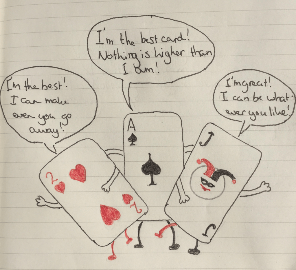 Joker is also a very good card: it imitates the card it’s played on, and that means you can even play an Ace if you don’t have it, hereby possibly forcing your opponent to take the pile, and to hate you for this. Use this one wisely.