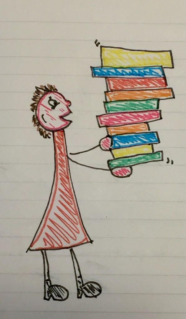 (It just took her quite a long time to reach it, for there were many other books drawing her attention, and, being quite a nice person and knowing it was rude to ignore those calling her name, she picked up all of them. Also, she wasn’t feeling terribly happy that day, so she needed these books to calm her down. She eventually put three books, all of which looked particularly pretty and comforting, in her basket with the present intended for the friend.)