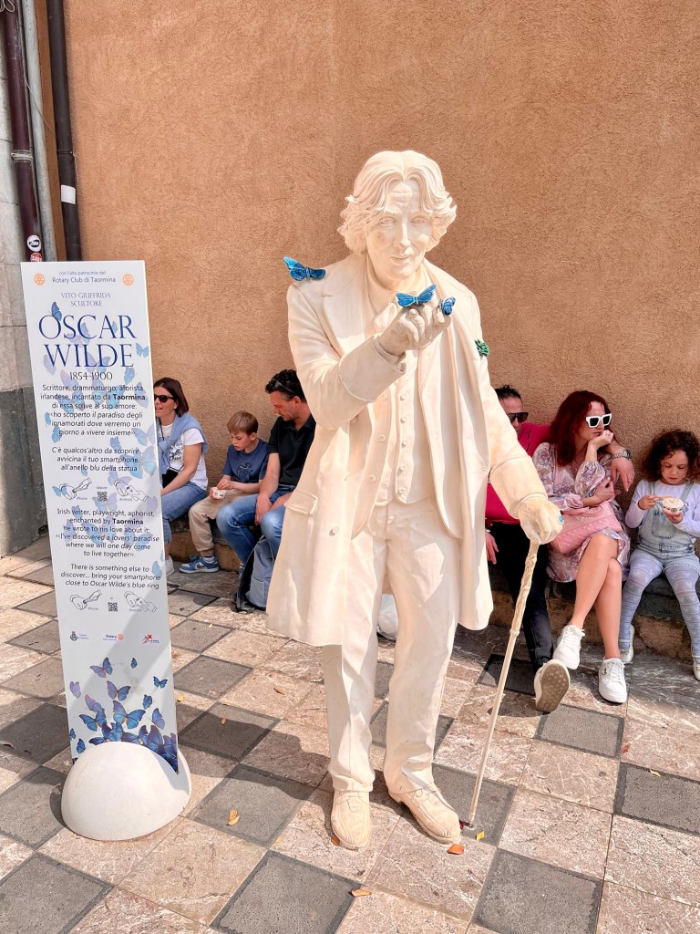 On our second day, we went to Taormina, a tiny but beautiful town located near the sea. Last time we were in Sicily, we visited this lovely city, too. This time, however it was absolutely packed with tourists. That’s because the second series of the hit show The White Lotus took place here. While Sicily is not exactly packed with tourists taking pictures of everything, Taormina has unfortunately become one of those inauthentic Instagram places. I don’t like it, but it was quite a bit of fun to watch all these sunburnt, overdressed tourists taking selfies. Also, we saw a statue of Oscar Wilde, who once declared his love for Taormina in one of his letters (I was supposed to give a lecture on him, but unfortunately that one was cancelled, too.) Here’s what I’ve learned: Tourists are annoying. (And yes, that probably includes us, too.)